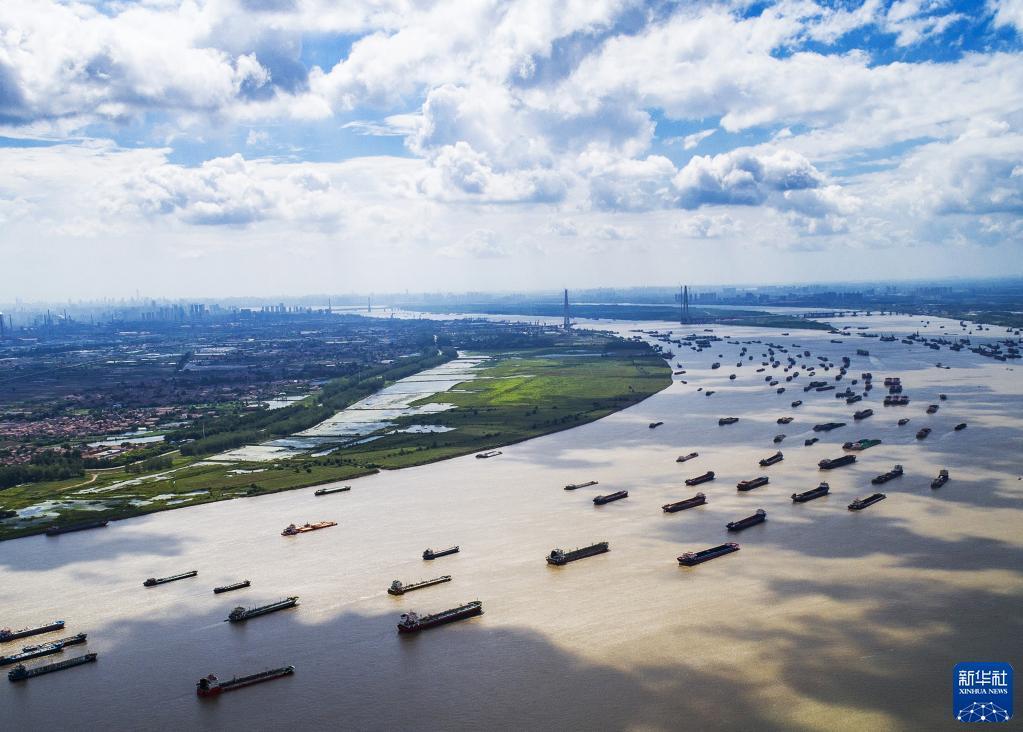 船舶在湖北省武汉市阳逻港区水域行驶(2018年8月13日摄,无人机照片)。(新华社记者 肖艺九 摄)