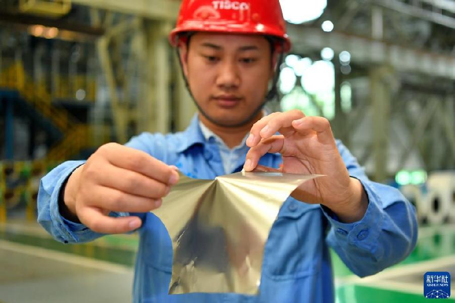 在位于山西的太钢集团,员工展示用手撕开0.02毫米厚的超薄带状不锈钢(2019年5月24日摄)。(新华社记者 曹阳 摄)