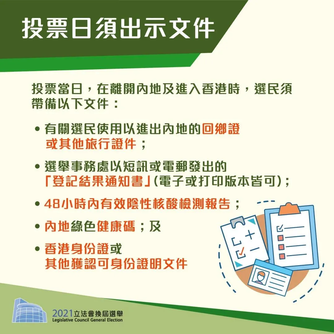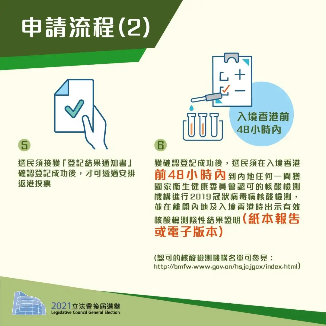 获确认登记成功后,选民须在入境香港前48小时内到内地任何一间获国家卫生健康委员会认可的核酸检测机构进行2019冠状病毒病核酸检测,并在离开内地及入境香港时出示有效核酸检测阴性结果证明(纸本报告或电子版本)。此外,有关选民亦须出示内地绿色健康码。