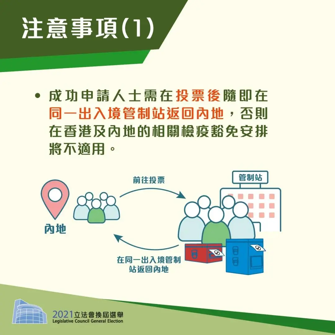 4. 根据特区政府与内地有关部门的协议,获成功登记的选民如在指定管制站投票站投票后随即于同一管制站返回内地,可获豁免在香港的检疫要求以及内地的集中隔离或医学监察安排。