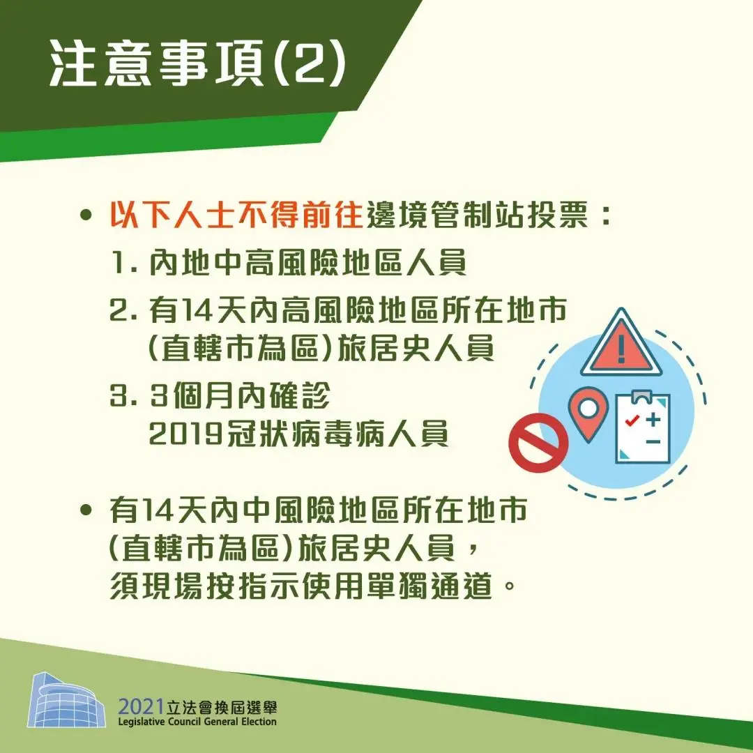 以下人士不得前往边境管制站投票:内地中高风险地区人员;有14天内高风险地区所在地市(直辖市为区)旅居史人员;及3个月内确诊新冠肺炎人员。14天内有中风险地区所在地市(直辖市为区)旅居史人员,须现场按指示使用单独通道。有关内地各地区的疫情风险等级,可参见由国家卫生健康委提供的疫情风险等级查询网页。请注意,若选民未能符合上述要求,可能不获出境。