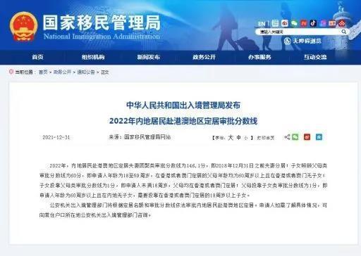 据中华人民共和国出入境管理局政府网站消息,2022年,内地居民赴港澳地区定居夫妻团聚类审批分数线为146.1分,即2018年12月31日之前夫妻分居;子女照顾父母类审批分数线为60分,即申请人年龄为18至59周岁,在香港或者澳门定居的父母年龄均为60周岁以上且在香港或者澳门无子女;子女投靠父母类审批分数线为1分,即申请人未满18周岁,父母均在香港或者澳门定居;父母投靠子女类审批分数线为1分,即申请人年龄为60周岁以上且在内地无子女,需要投靠在香港或者澳门定居的18周岁以上子女。
