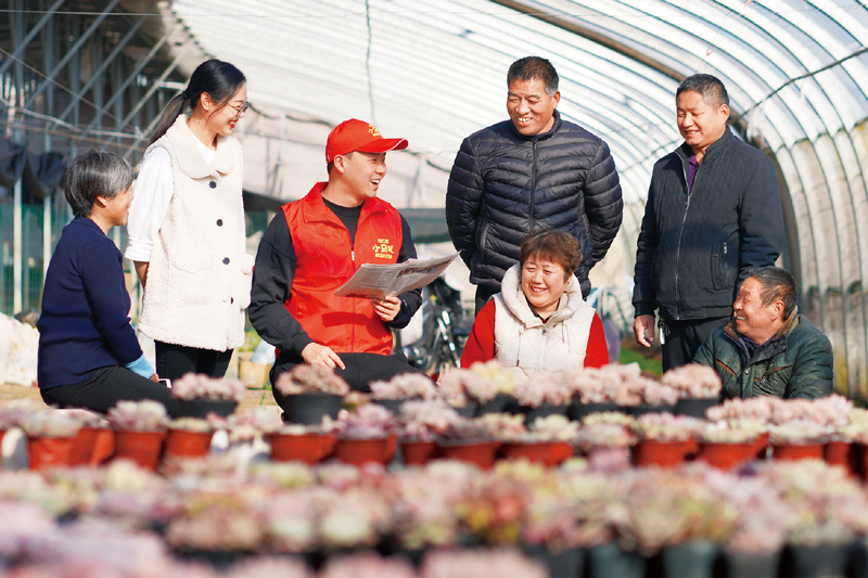 河北省邢台市内丘县组织六十二支“小马扎”宣讲小分队深入到社区、学校、农村和企业,利用快板、诗歌、说唱等群众喜闻乐见的形式开展宣讲活动,把党的十九届六中全会精神送到群众家门口。图为2021年11月23日,“小马扎”宣讲小分队队员在马涧村花卉大棚宣讲全会精神。(人民图片 刘继东 摄)