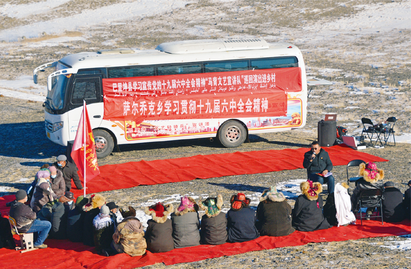 新疆巴里坤哈萨克自治县组建“马背文艺宣讲队”,深入边远农牧区乡村开展党的十九届六中全会精神巡回宣讲。图为2021年12月1日,宣讲队给冬牧场的哈萨克族牧民宣讲全会精神。(人民图片 张建刚 摄)
