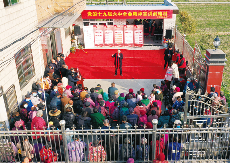2021年12月5日,江苏省海安市曲塘镇群贤村开展“党的十九届六中全会精神宣讲到咱村”活动,通过百姓名嘴宣讲、文艺表演、诗朗诵等形式,向群众宣传全会精神。(人民视觉 姜明 摄)