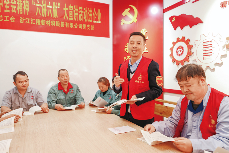浙江省湖州市德清县总工会组织由车间政委、劳动模范、浙江工匠等组成的“典型模范宣讲团”走进企业宣讲党的十九届六中全会精神。图为2021年11月30日,宣讲团成员在浙江汇隆新材料股份有限公司的红色车间为职工宣讲全会精神。(人民图片 姚海翔 摄)