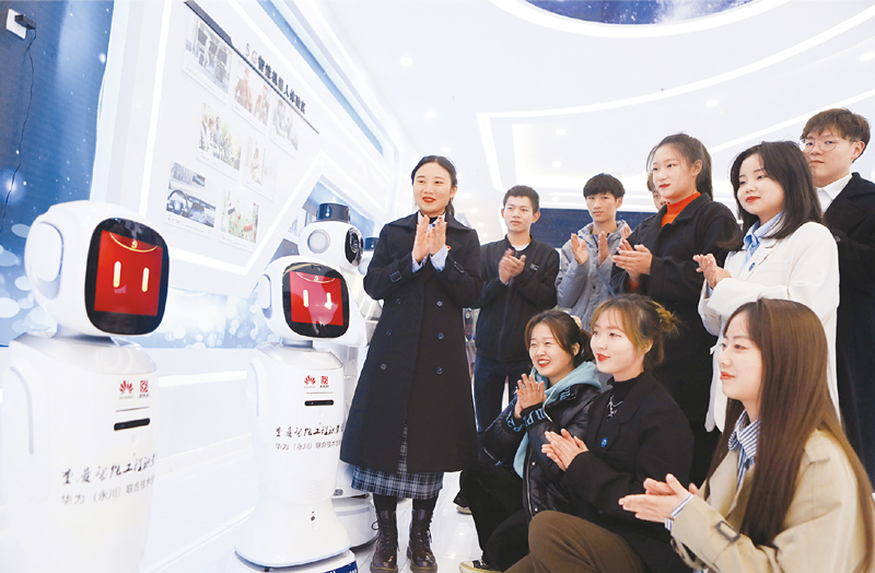 2021年11月13日,重庆智能工程职业学院校园内,智能机器人“大华”、“大智”向学生们普及党的十九届六中全会精神,其可爱的形象和声音,深受学生们的喜爱。(人民图片 陈仕川 摄)