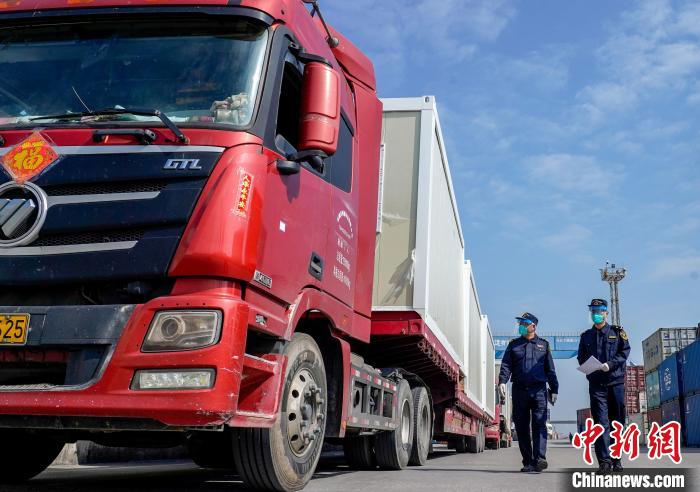 番禺海关关员在核对供港建设“方舱医院”活动房屋数量(董建华 摄)