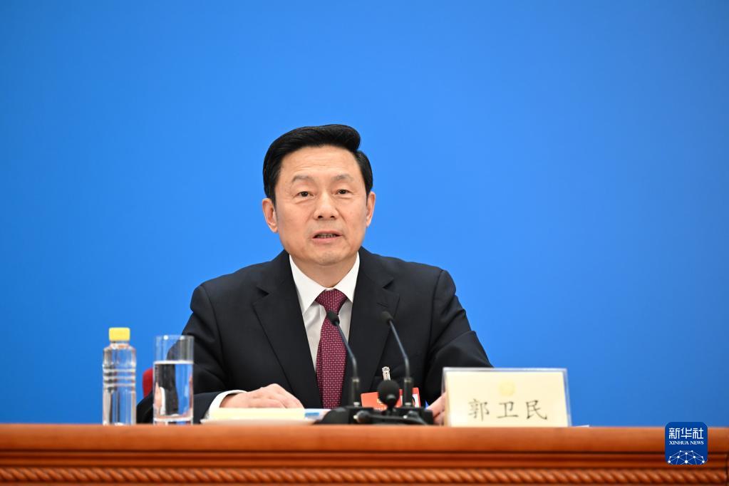 3月3日,全国政协十三届五次会议新闻发布会在北京人民大会堂举行。为有效防控疫情,本次新闻发布会沿用前两年做法,采用网络视频的形式举行,主会场设在人民大会堂,分会场设在梅地亚中心。这是大会新闻发言人郭卫民在主会场回答记者提问。(新华社记者 殷刚 摄)