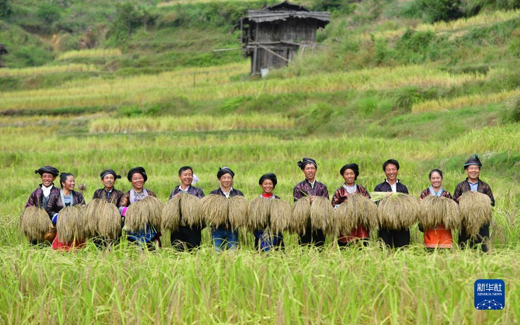 在广西融水苗族自治县良寨乡大里村,村民们展示刚刚收割的脱贫特色产品——紫黑香糯(2018年10月12日摄)。(新华社记者 黄孝邦 摄)