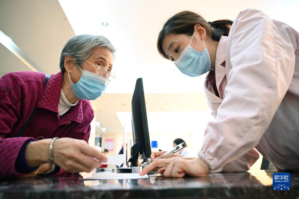 福建省三明市第一医院的医保办工作人员(右)向前来咨询药品报销问题的居民讲解相关政策(2020年11月18日摄)。(新华社记者 姜克红 摄)