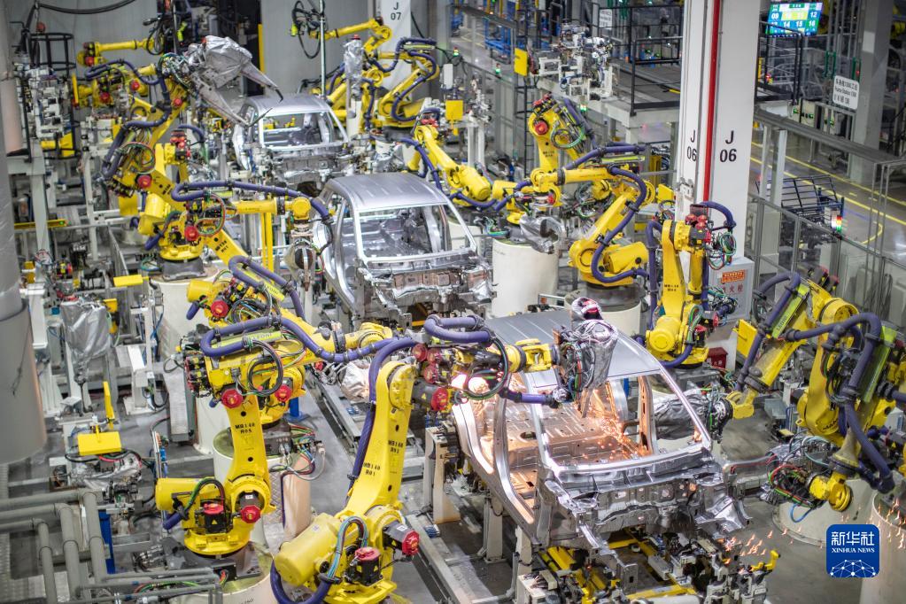 重庆一家新能源汽车企业使用智能化焊接机器人进行焊接作业(2021年4月2日摄)。(新华社记者 黄伟 摄)