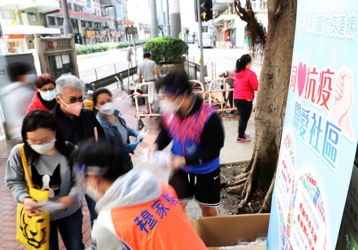 3月1日,在香港湾仔区一处街站,义工免费派送中央援港抗疫物资。(新华社记者李钢 摄)