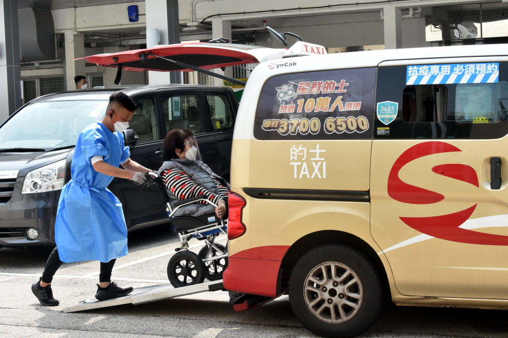3月18日,在香港南葵涌,抗疫专用的士接载市民候诊。(新华社记者卢炳辉 摄)