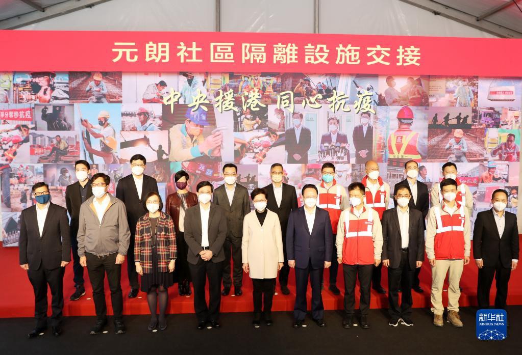3月24日,香港特区行政长官林郑月娥(前左五)等出席元朗社区隔离设施交接仪式。(新华社记者 李钢 摄)