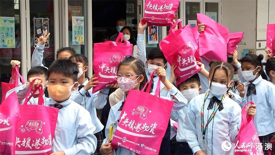 中央援港抗疫派发现场,学生们领取抗疫物资包。(人民网 严小晶 摄)