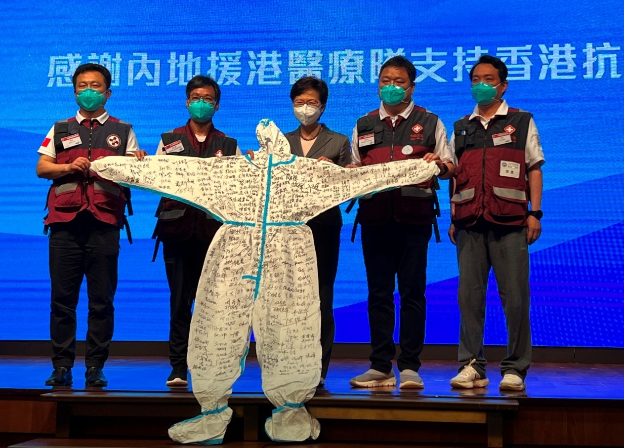 内地援港医疗队于3月份来港,391名队员来自广州、深圳、佛山、珠海等地市的25家医院,包括医生、护士、感控专家和中医师等。医疗队在港期间负责亚博馆社区治疗中心的新冠肺炎患者医疗护理工作,累计治疗超过1200名患者。离港前,内地援港医疗队向特区政府送上一件由391名医护亲笔签名的防护衣作为纪念。