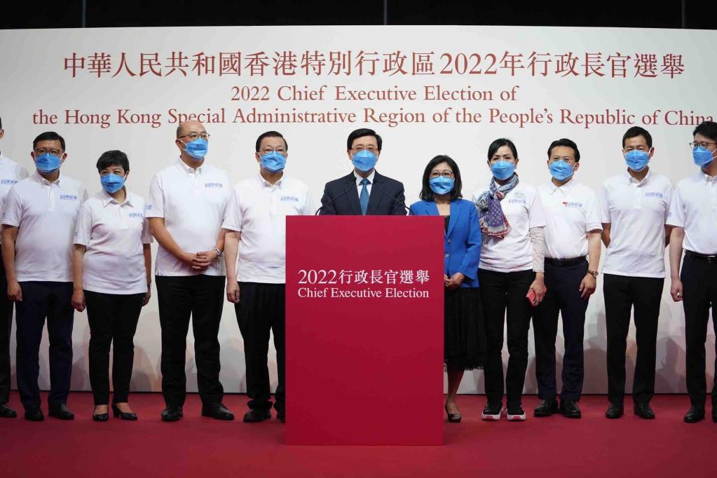 5月8日,李家超当选香港特别行政区第六任行政长官人选。这是李家超(左五)出席新闻发布会。(新华社记者 吕小炜 摄)