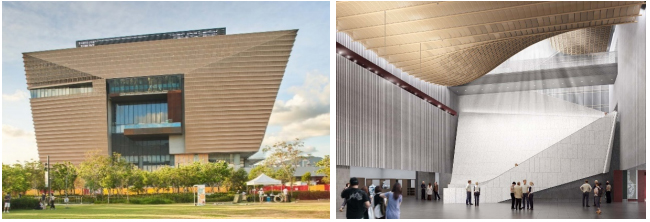 香港故宫文化博物馆外观(左)、香港故宫文化博物馆内景(右)。(图源香港故宫文化博物馆)