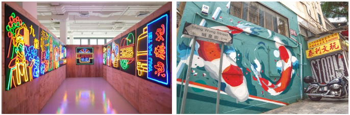 西九龙文化区艺术展览(左)、荷里活道中式锦鲤壁画(右)。(图源香港旅游发展局)