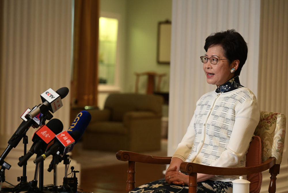香港特区行政长官林郑月娥在礼宾府接受记者采访。(新华社记者 金良快 摄)