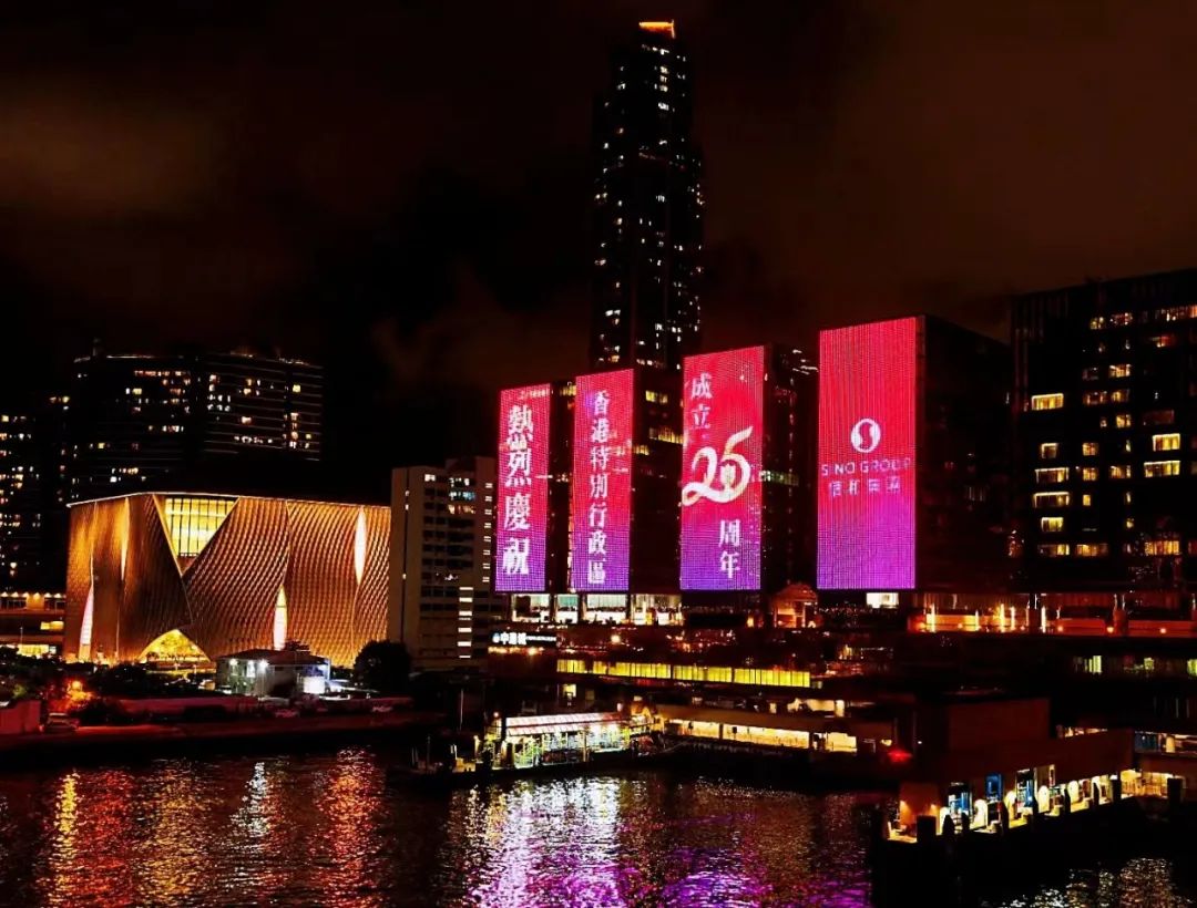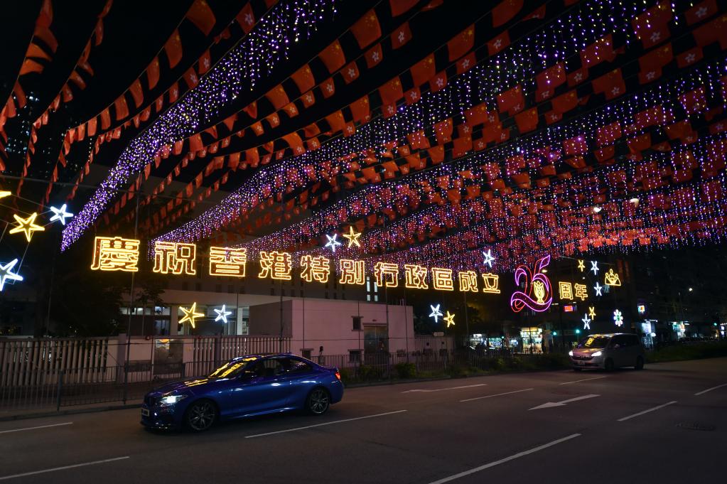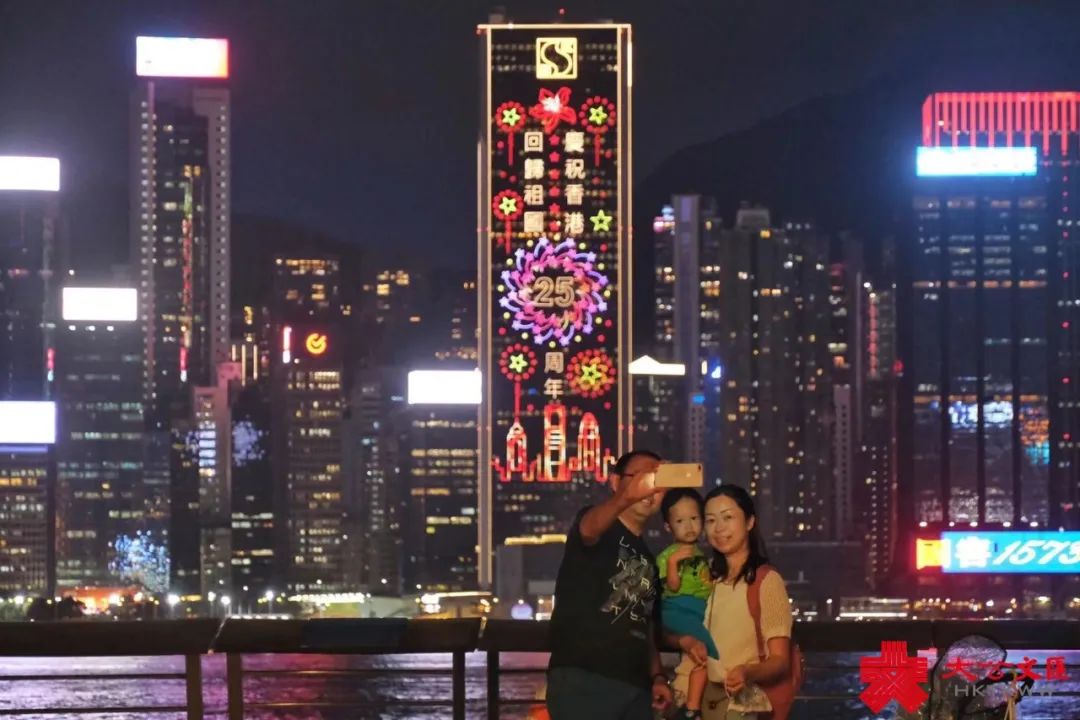 距离香港回归祖国25周年纪念日还有几天时间,喜庆的气氛已在香港街头洋溢。港岛、九龙、新界,大大小小的庆祝横幅、海报点缀着大街小巷;到了夜晚,一束束斑斓的灯光照亮这座城市的墨色苍穹。