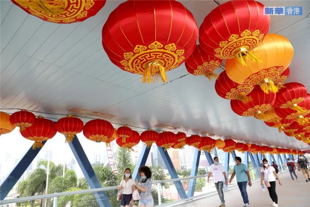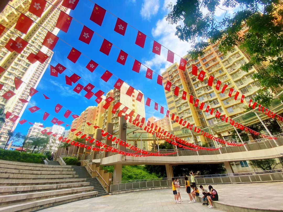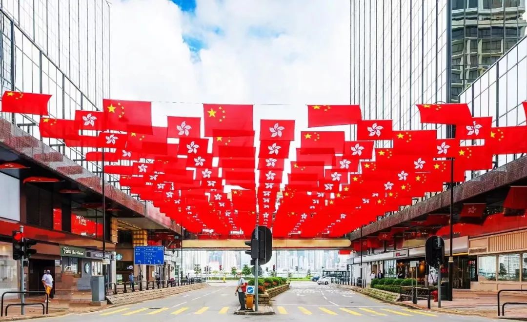 利东街是一条位于港岛湾仔的步行街,长约200米的街道汇集了餐厅、茶座、手办店等众多商铺。随着回归纪念日的临近,红色成为利东街的主色调,由国旗与区旗交织组成的旗阵高悬于中庭,随风轻轻拂动,场面壮观,引得路人驻足观看。