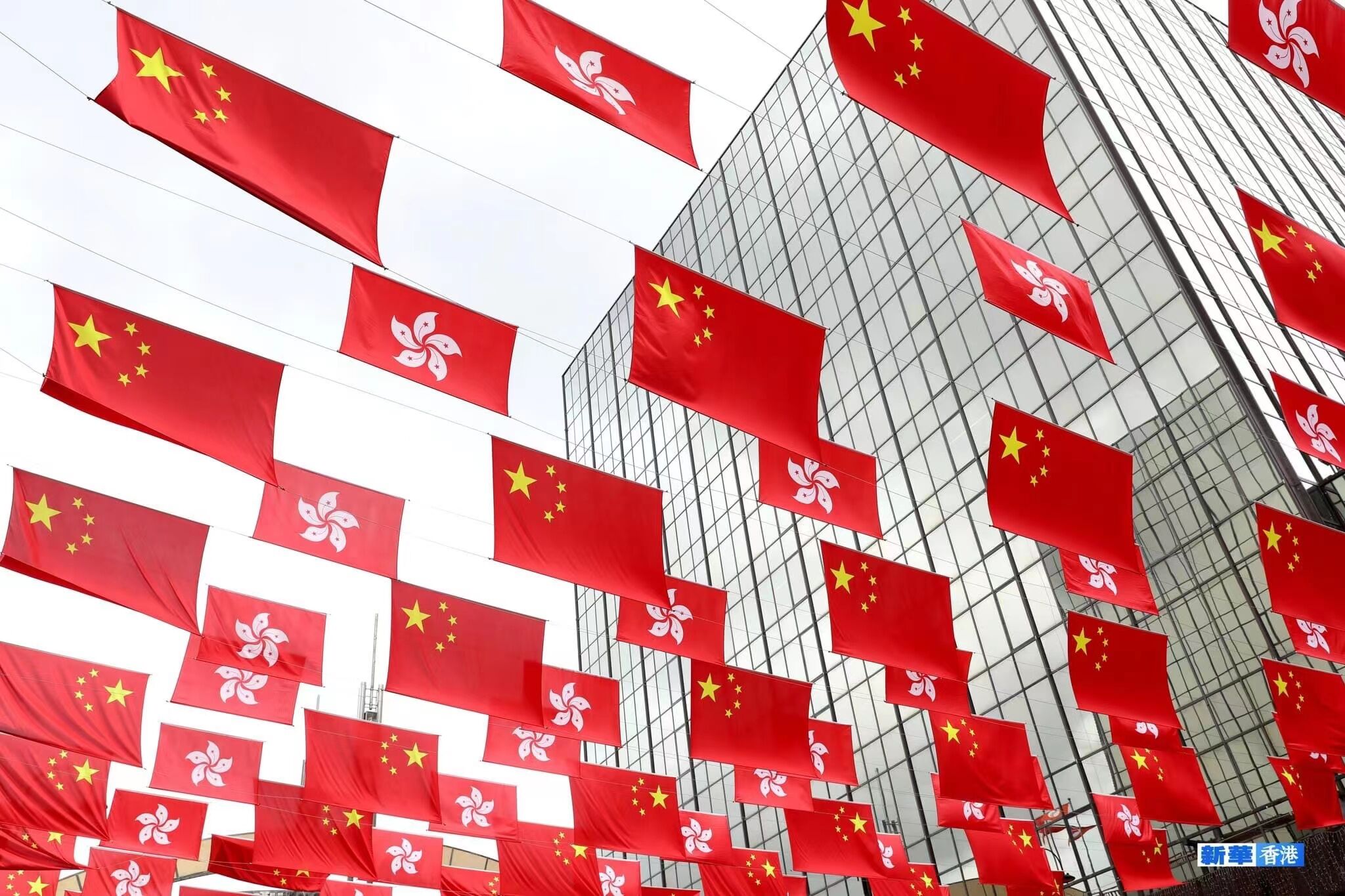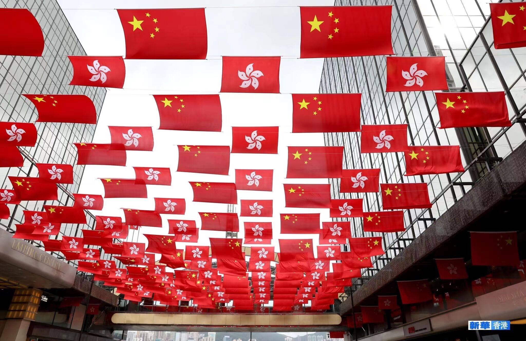 6月16日,在香港利东街,中华人民共和国国旗和香港特别行政区区旗迎风飘扬。(新华社记者 李钢 摄)