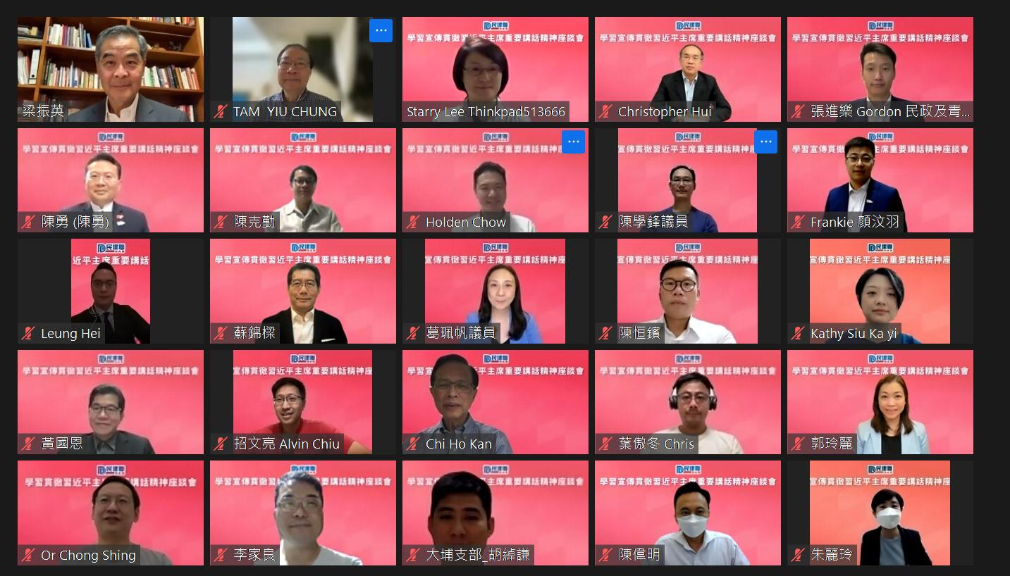 本网讯 7月6日晚,民主建港协进联盟(民建联)以线上方式举办学习宣传贯彻习近平主席重要讲话精神座谈会。民建联主席李慧琼主持会议,全国政协副主席梁振英、全国人大常委会委员谭耀宗应邀担任主讲嘉宾。民建联会务顾问、监委、执委、议员、地区和职员骨干,以及特区政府财经及库务局局长许正宇、商务及经济发展局副局长陈百里、政制及内地事务局副局长胡健民等身兼民建联成员的官员约200人出席。