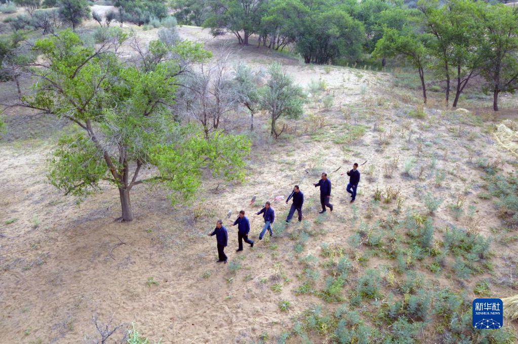 在甘肃省武威市古浪县八步沙林场,场长郭万刚(左一)和大家一起前往治沙点(2019年8月23日摄,无人机照片)。(新华社记者 范培珅 摄)