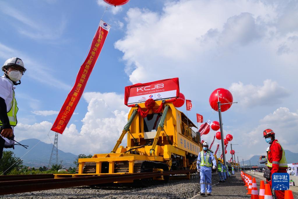 工作人员在印度尼西亚万隆雅万高铁铺轨施工现场作业(2022年4月20日摄)。(新华社记者 徐钦 摄)