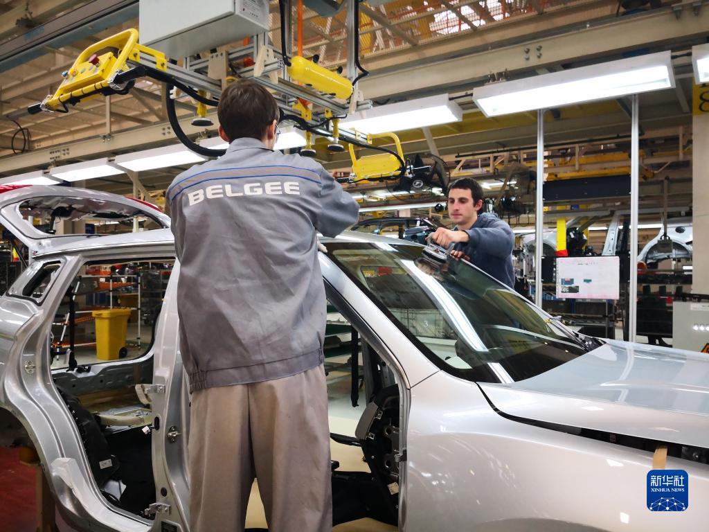 在白俄罗斯首都明斯克东北方向50公里处的白俄罗斯吉利全散件汽车制造厂总装车间,工人组装车体(2018年12月1日摄)。(新华社记者 张若玄 摄)