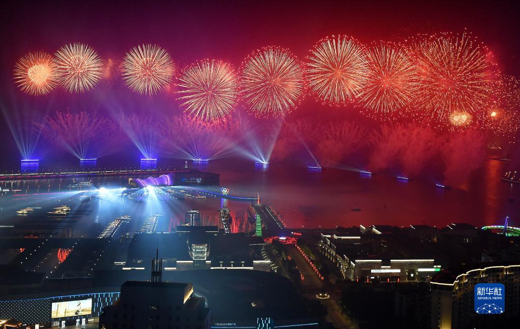 这是在青岛举行的《有朋自远方来》灯光焰火艺术表演(2018年6月9日晚摄)。2018年6月9日至10日,上海合作组织成员国元首理事会第十八次会议在青岛召开。(新华社记者 李紫恒 摄)