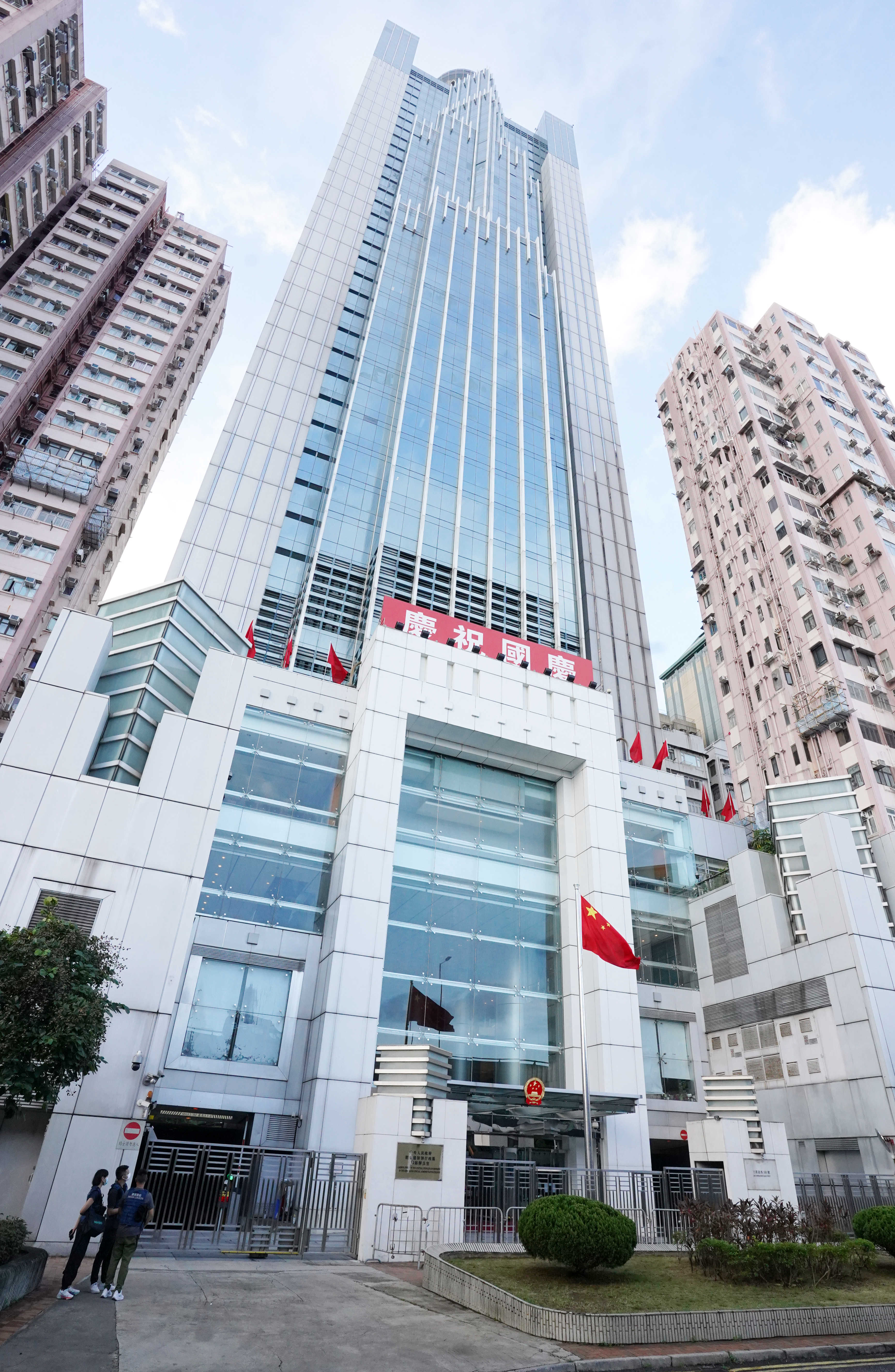 7时整,升国旗仪式开始。香港中联办副主任陈冬、卢新宁、罗永纲、何靖、尹宗华,以及干部员工代表在办公楼前庄严肃立。升旗手护送国旗进场,步伐铿锵。伴随着雄壮的国歌声,鲜艳的五星红旗冉冉升起。全体人员行注目礼向国旗致敬,齐声高唱国歌,祝福伟大祖国繁荣富强、国泰民安。