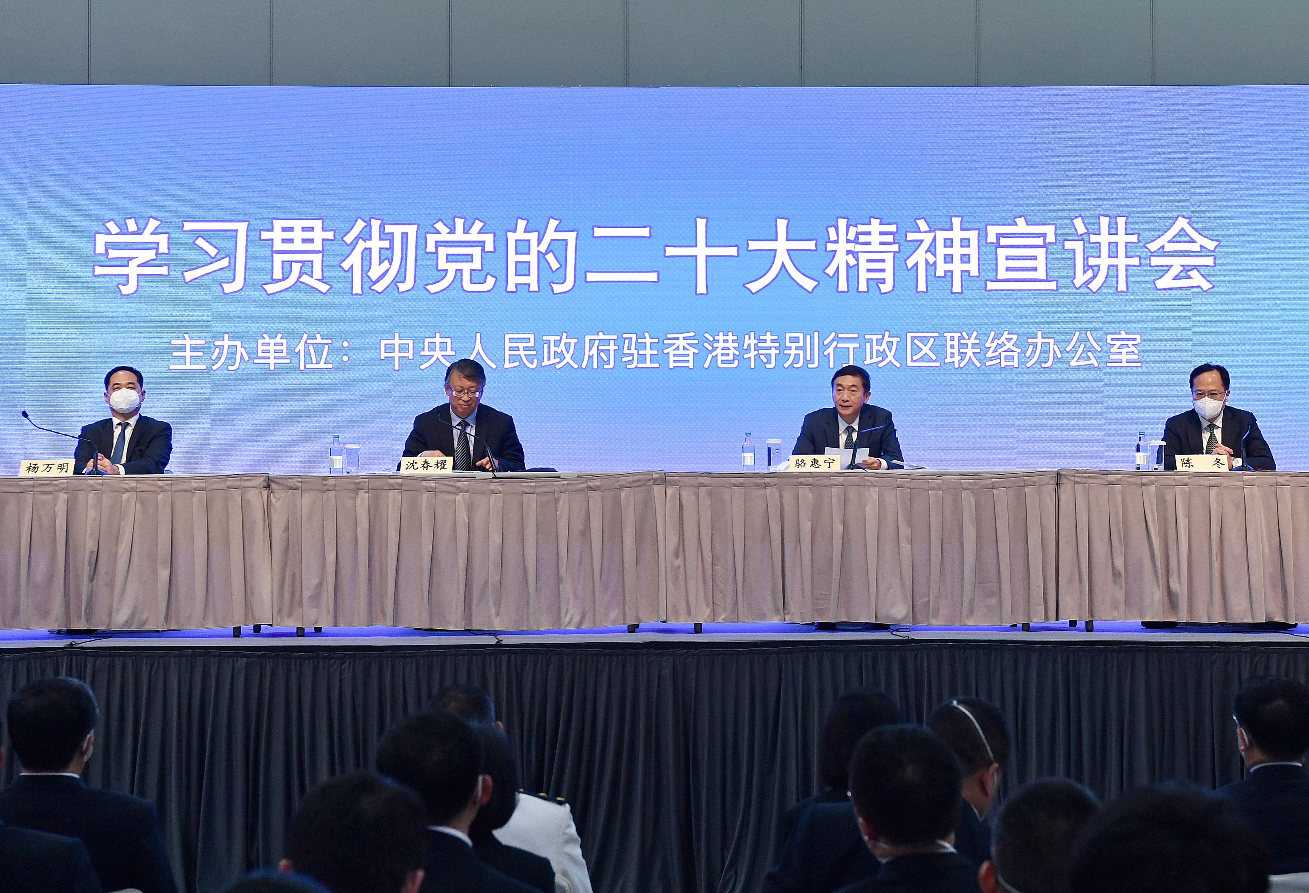 骆惠宁在主持讲话中指出,中央宣讲团来港宣讲,充分体现了以习近平同志为核心的党中央对香港“一国两制”事业的高度重视,对中央驻港机构、中资企业的亲切关怀。沈春耀主任的精彩宣讲,对于我们进一步加深对二十大精神的领悟,把思想和行动统一到二十大部署要求上来,把学习宣传贯彻工作更好引向深入,具有重要引导和促进作用。要以此次中央宣讲为契机,进一步贯彻落实好习近平总书记关于“全面学习、全面把握、全面落实”的重大要求,把学习宣传贯彻二十大精神与深入贯彻落实习近平总书记7月1日在港重要讲话结合起来,把总体把握二十大战略部署与推进“一国两制”实践结合起来,把发挥中央驻港机构带头作用与激发社会各界主动性结合起来,学深悟透,学以致用,把学习宣传贯彻二十大精神的成果,转化为扎实推进自身工作的实际行动,进一步激发建设香港、贡献国家的强大正能量。