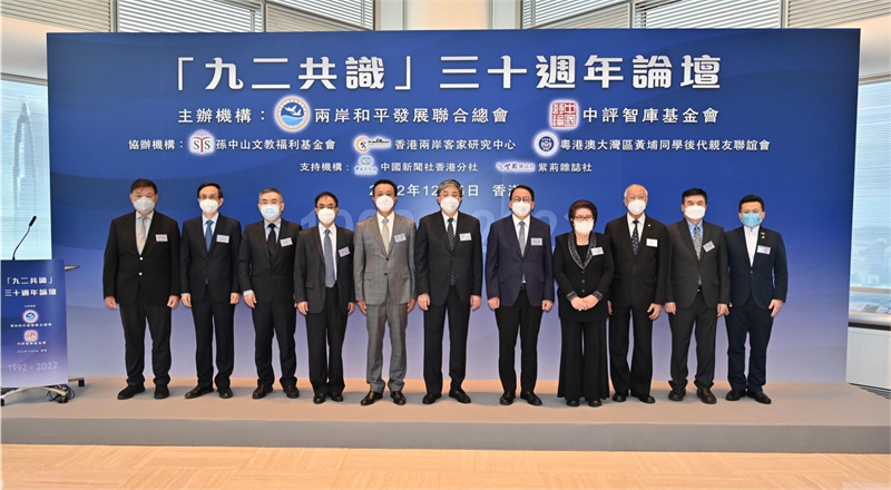 本网讯 12月5日,由两岸和平发展联合总会、中评智库基金会联合主办的“九二共识”30周年论坛在港举行。特区政府政务司司长陈国基、中央政府驻港联络办副主任罗永纲出席并致辞,海峡两岸关系协会会长张志军、国民党前主席洪秀柱视频致辞。香港涉台社团代表、居港台胞逾100人参加。