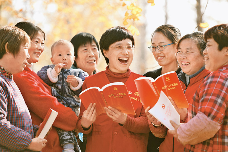 图为2022年11月17日,山东省临沂市郯城县“巾帼宣讲团”成员为群众宣讲党的二十大精神。(人民图片 房德华/摄)