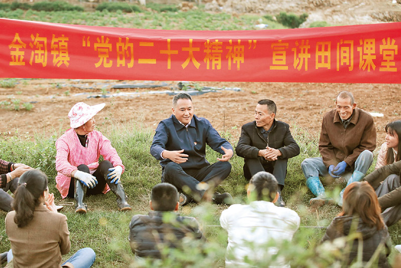 图为2022年12月18日,理论宣讲员在福建省南安市金淘镇中心村“党建+”百亩马铃薯基地为村民宣讲党的二十大精神。(中新社发 谢贵明/摄)