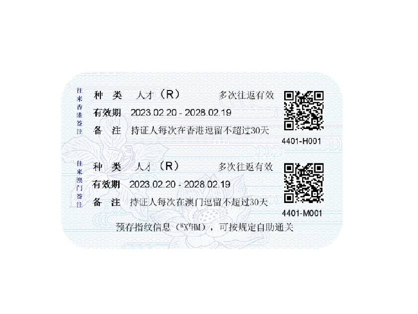 往来港澳人才签注式样。(中华人民共和国出入境管理局供图)