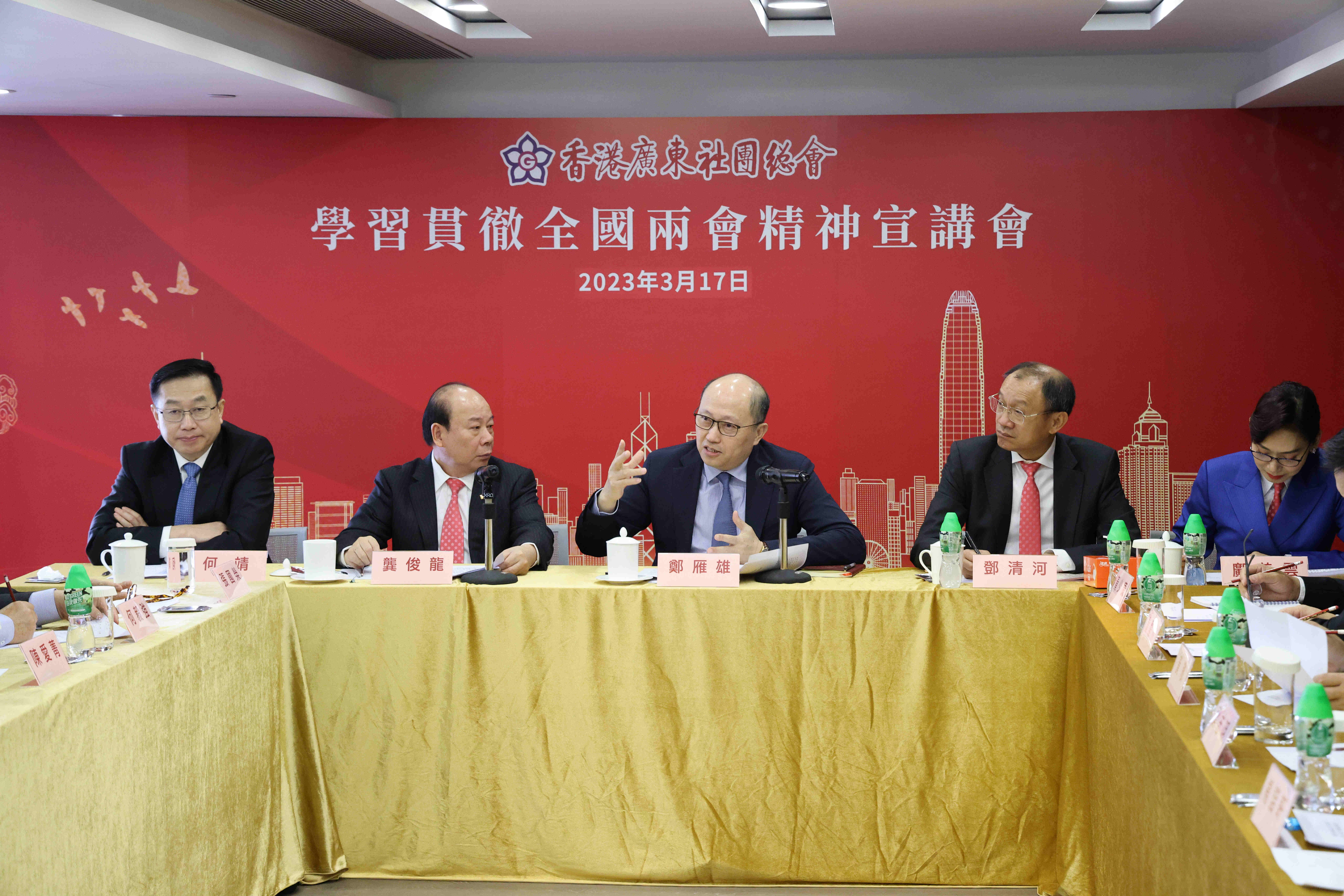 郑雁雄出席香港广东社团总会举办的学习贯彻全国两会精神宣讲会。(图片来源:中央政府驻港联络办)