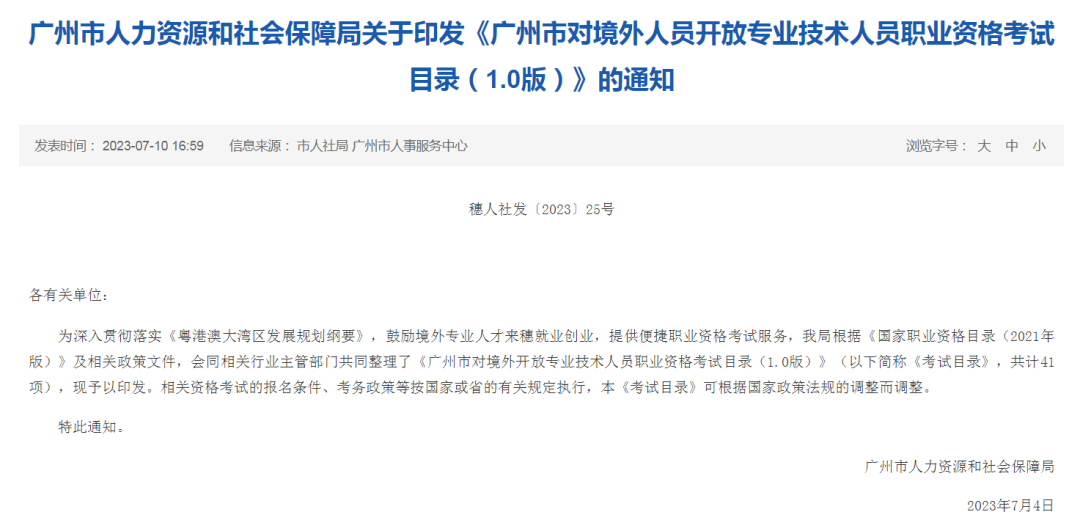 7月11日,广州市人事服务中心负责人表示,《广州市对境外人员开放专业技术人员职业资格考试目录(1.0版)》(以下简称《目录》)已于近日印发实施,《目录》明确注册会计师、造价工程师、建造师、税务师等专业技术类职业资格考试分类对境外来穗专业人才开放。