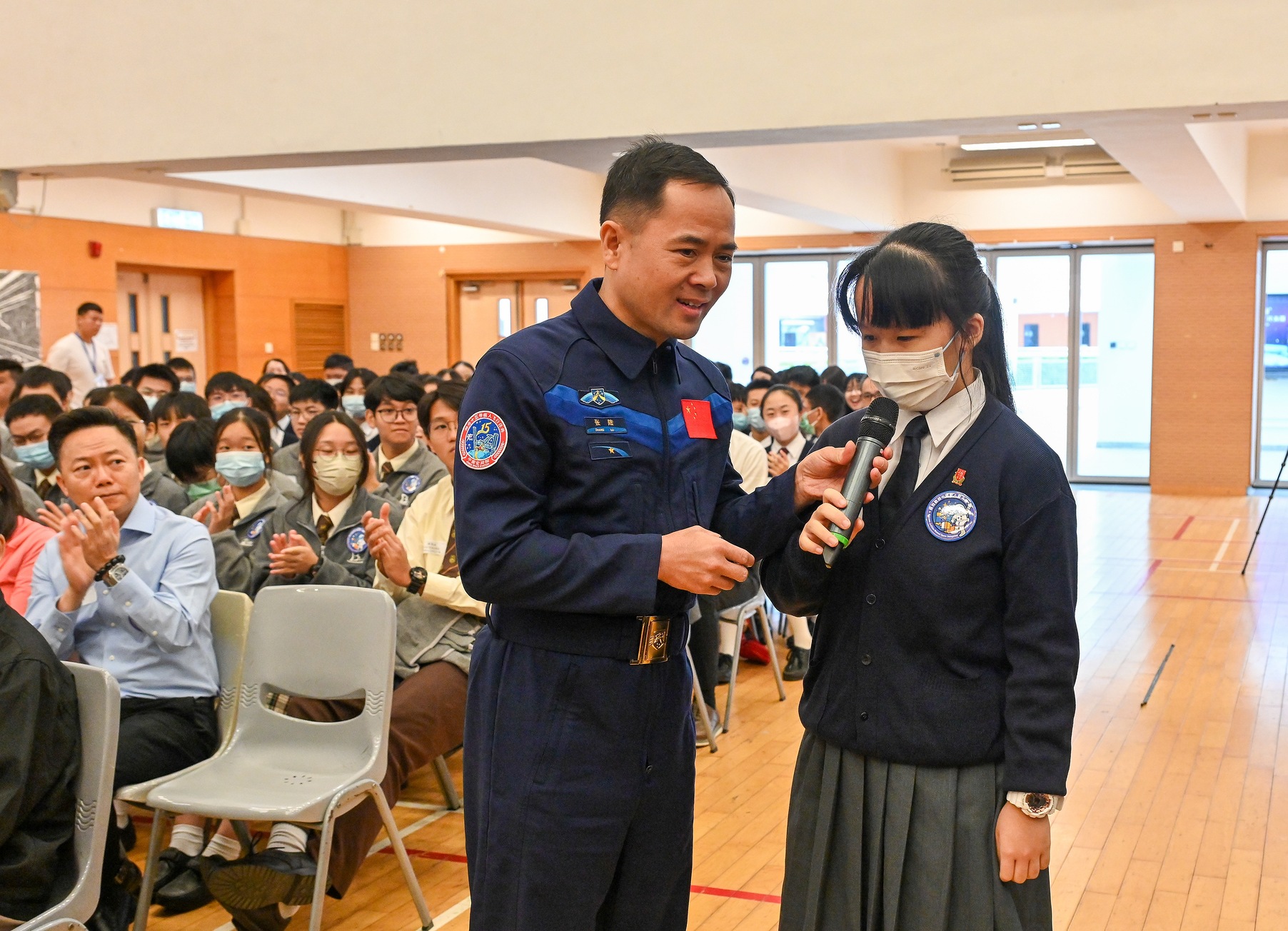 中国载人航天工程代表团11月29日继续在港访问,图示神舟十五号乘组航天员张陆(左)出席在香港浸会大学附属学校王锦辉中小学(中学部)举行的“中国载人航天工程代表团与中、小学生真情对话”活动。