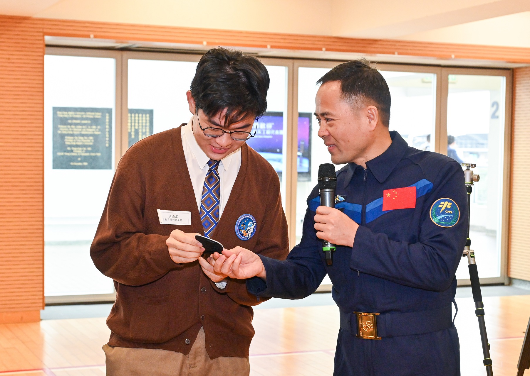 中国载人航天工程代表团11月29日继续在港访问,图示神舟十五号乘组航天员张陆(右)出席在香港浸会大学附属学校王锦辉中小学(中学部)举行的“中国载人航天工程代表团与中、小学生真情对话”活动。