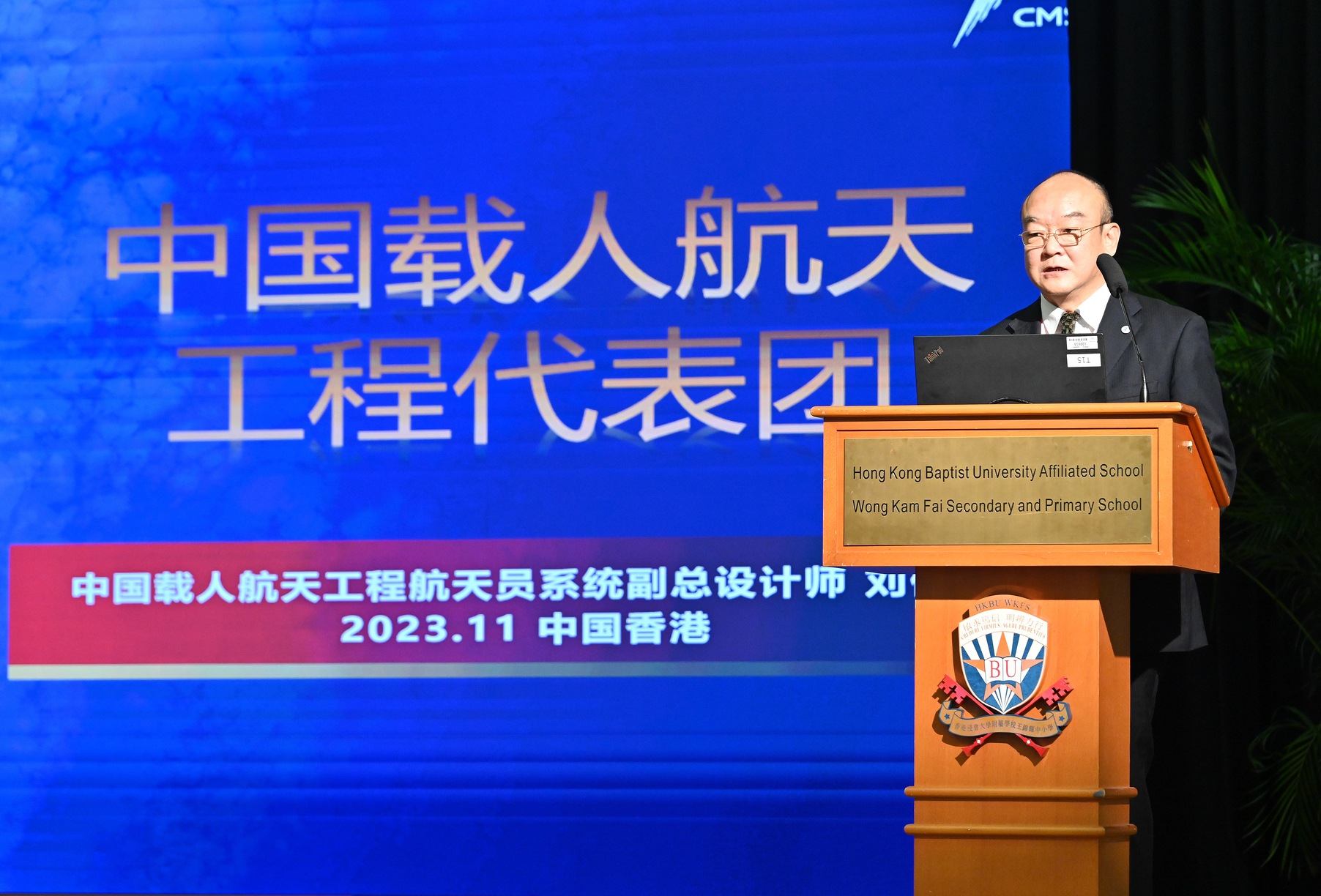 中国载人航天工程代表团11月29日继续在港访问,图示中国载人航天工程航天员系统副总设计师刘伟波出席在香港浸会大学附属学校王锦辉中小学(中学部)举行的“中国载人航天工程代表团与中、小学生真情对话”活动。
