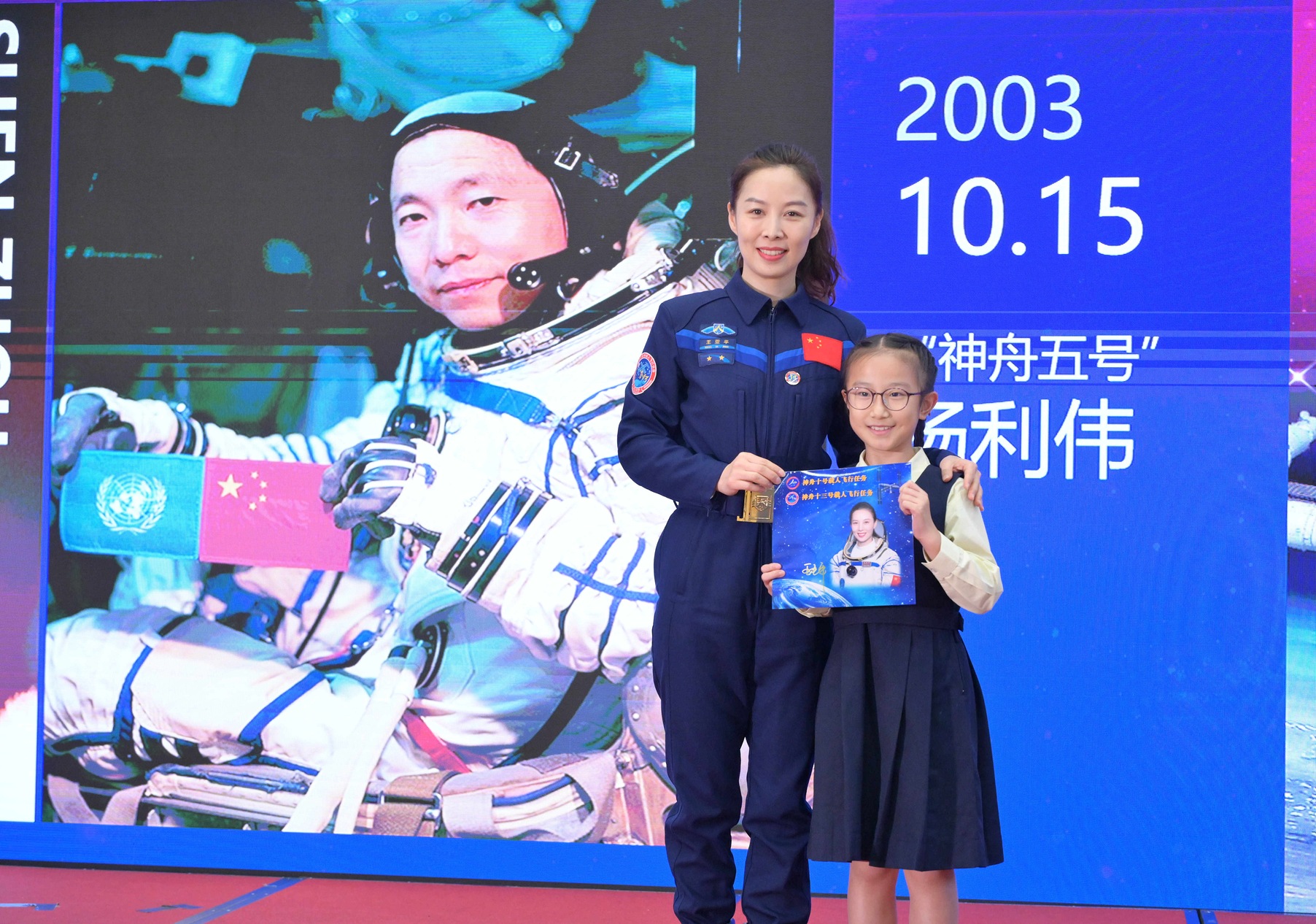 中国载人航天工程代表团11月29日继续在港访问,图示神舟十三号乘组航天员王亚平(左)出席在香港浸会大学附属学校王锦辉中小学(小学部)举行的“中国载人航天工程代表团与中、小学生真情对话”活动。