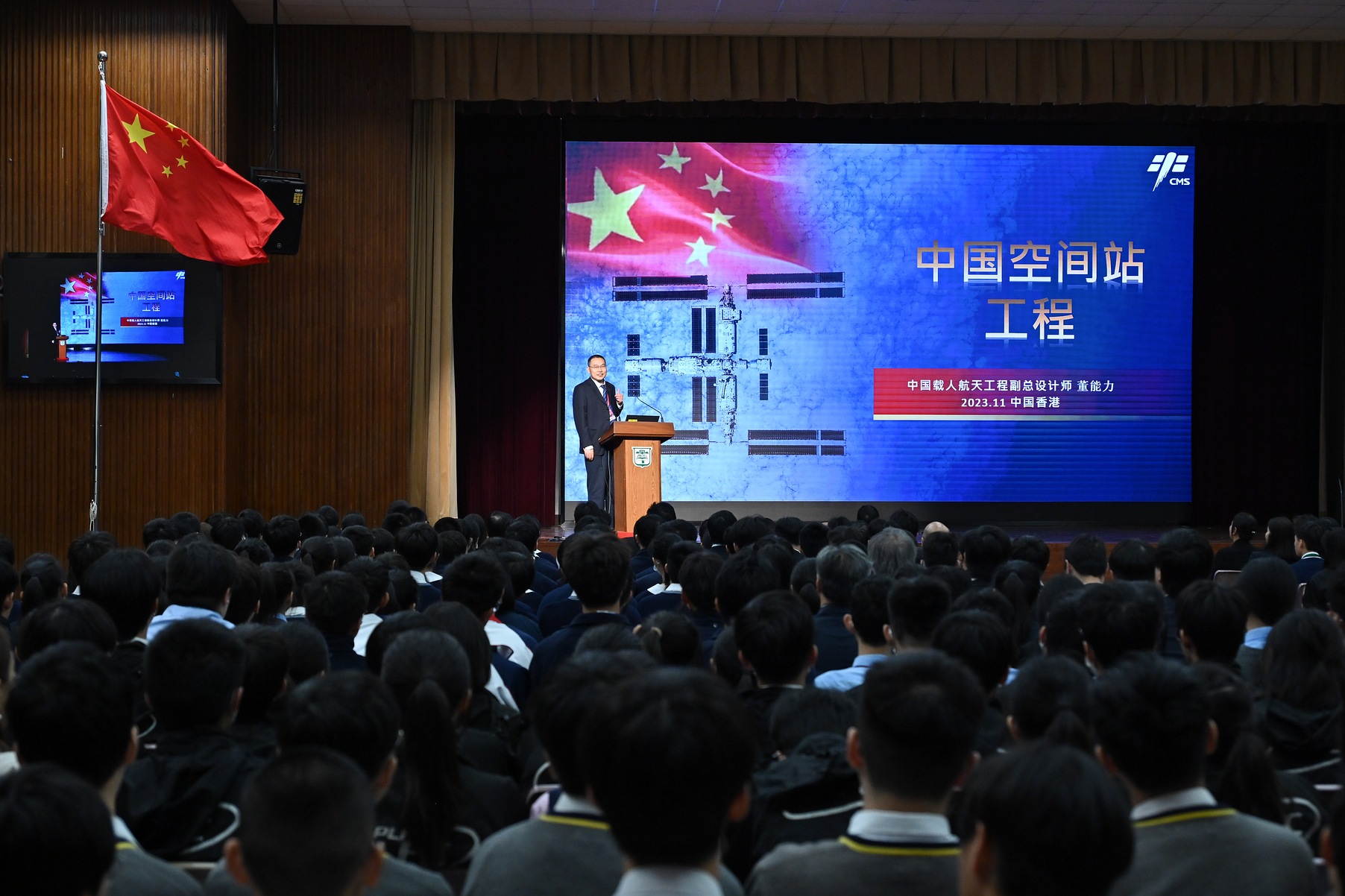 中国载人航天工程代表团11月29日继续在港访问,图示中国载人航天工程副总设计师董能力出席在培侨中学举行的“中国载人航天工程代表团与中、小学生真情对话”活动。
