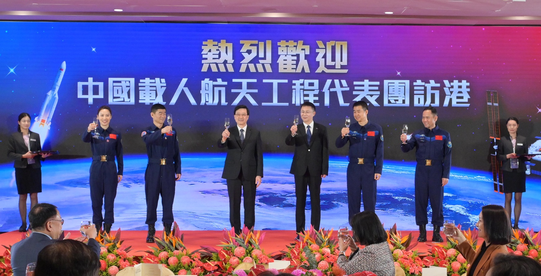中国载人航天工程代表团11月28日抵港,进行四天的访问。图示香港特区行政长官李家超(左四)和代表团团长、中国载人航天工程办公室林西强副主任(右四)与其他代表团成员主持祝酒仪式。