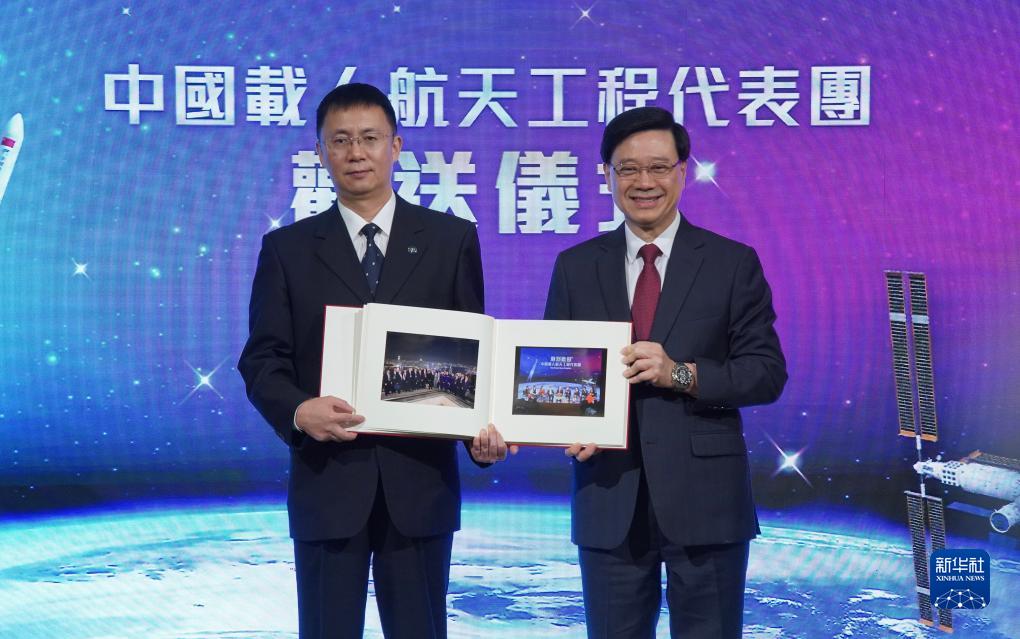 在离开香港前,香港特区政府在礼宾府为代表团举行了欢送仪式。香港特区行政长官李家超致辞时表示,通过这次访问,相信香港市民都能深深感受到中国人在实现航天梦的征程上,具有坚定的奋斗决心。香港市民也为国家在航天科技上取得的非凡成就,深感自豪。