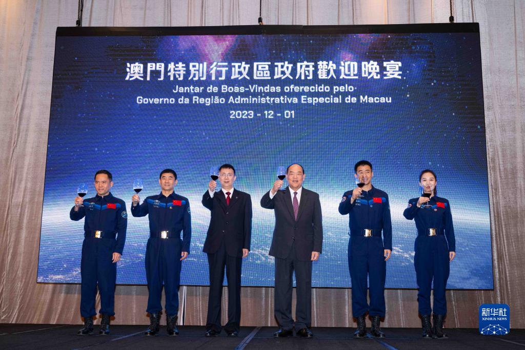12月1日,澳门特区行政长官贺一诚(右三)、中国载人航天工程办公室副主任、代表团团长林西强(左三)和代表团成员在欢迎晚宴上祝酒。新华社记者 张金加 摄
