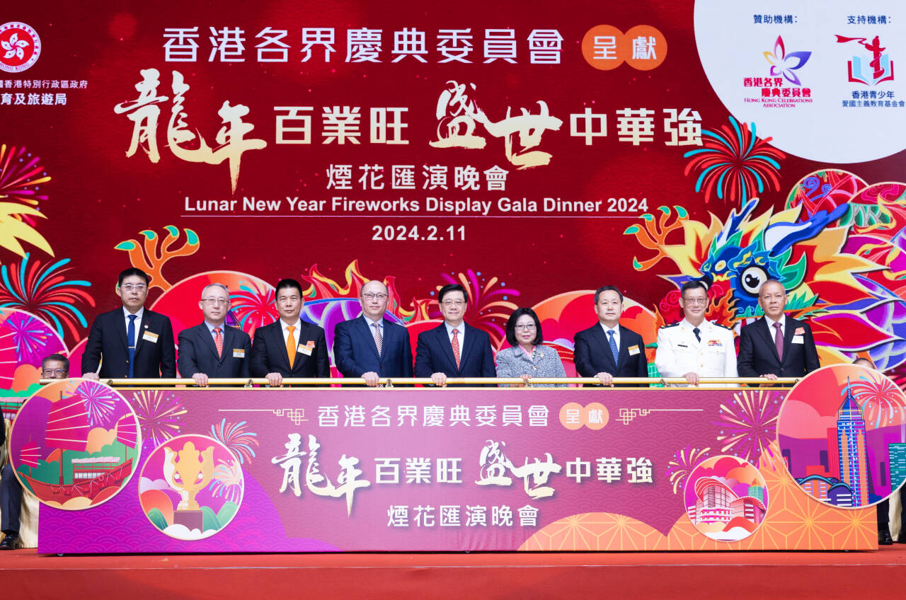 本网讯 2月11日晚,香港各界庆典委员会在会展中心举办“龙年百业旺 盛世中华强”贺岁烟花汇演晚会。香港特区行政长官李家超、中央政府驻港联络办主任郑雁雄,以及驻港国家安全公署、外交部驻港特派员公署、解放军驻港部队负责人应邀出席。